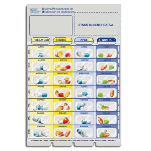 - Si ésta última opción no es posible, os recomiendo preguntar a vuestro farmacéutico/a de confianza por la posibilidad de que os prepare un SPD (sistema personalizado de dosificación), un dispositivo cerrado herméticamente como el que aparece en la imagen (o muy parecido) que contiene los medicamentos del paciente y todas las indicaciones necesarias para la correcta administración de los mismos.